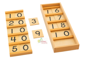 The Teen Board uses the knowledge of the bead stair to introduce the quantities and vocabulary of numbers 11-19.A wooden box with lid containing 2 teen boards (teaching 11-19) and 9 wooden cards with the numerals 1-9 printed in USA print.